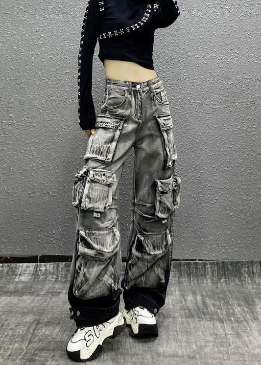Casual Gray Black Multi Pocket Denim Pants Autumn RI001