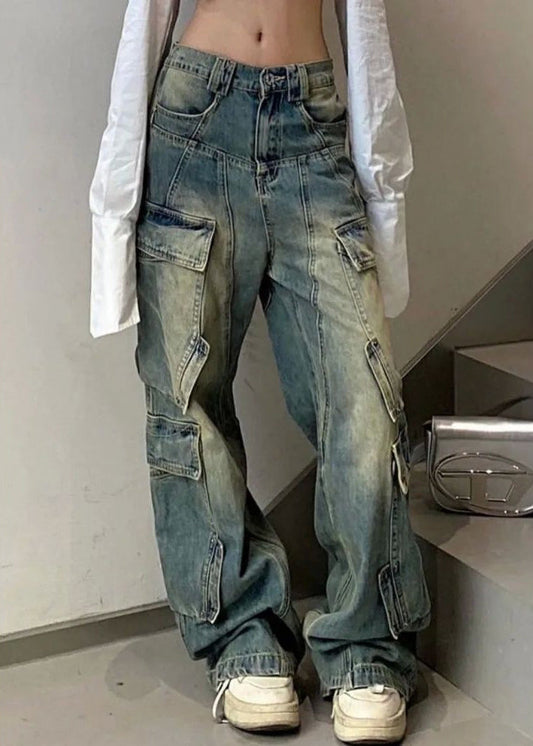 French Blue Pockets High Waist Neutral Denim Pants Summer PP018