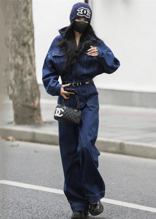 French Blue Peter Pan Collar Pockets Denim Jumpsuit Fall MN049