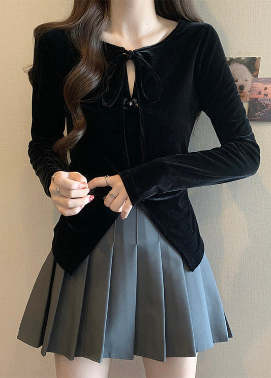 French Brown Lace Up Front Open Silk Velour Shirts Winter WK032