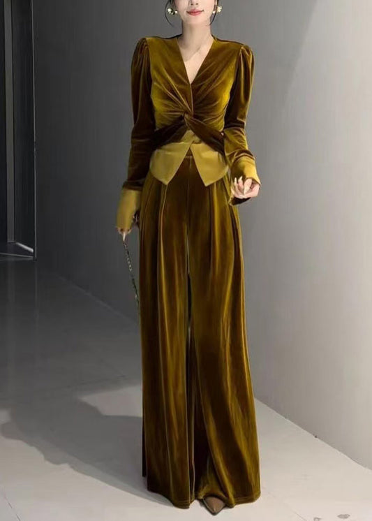 French Green V Neck Silk Velvet Two Pieces Set Spring TQ030