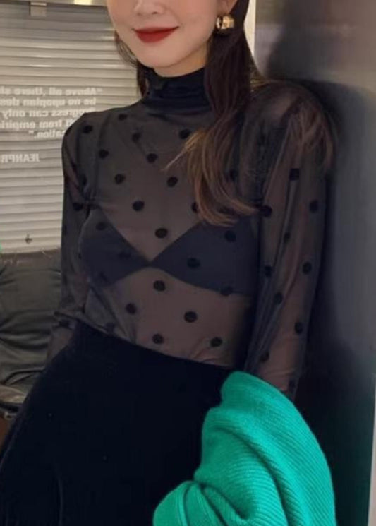 French Khaki Hign Neck Dot Slim Fit Tulle Tops Fall RF004