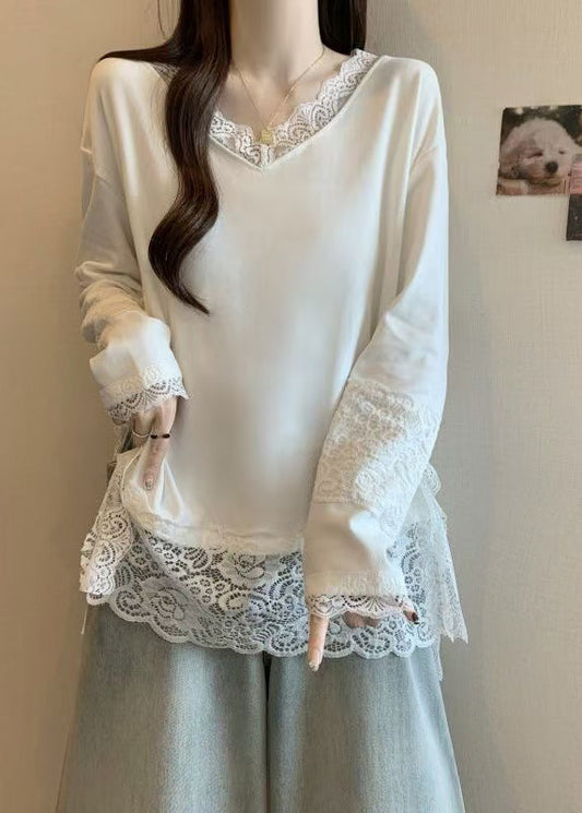 French Grey V Neck Lace Patchwork Cotton T Shirt Top Spring TW011