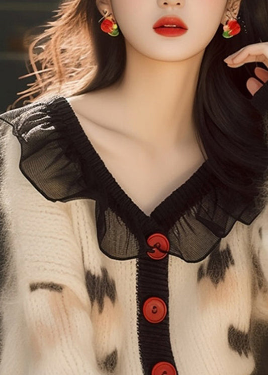 French White Ruffled Print Button Knit Cardigans Spring TN031
