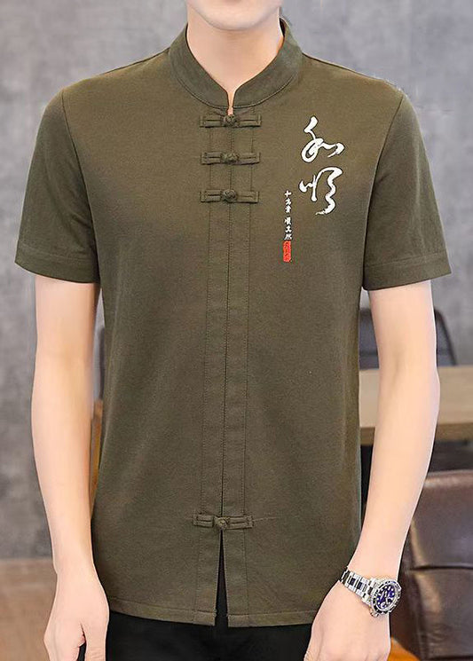 Green Mens Army Shirt Collar Cotton Chinese Stand T Style Print