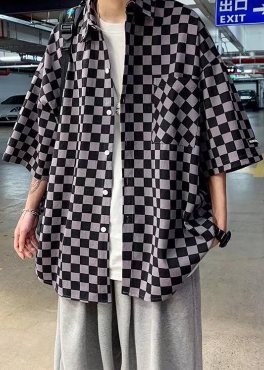Half Plaid Men Peter Cotton Button Black Collar Shirts Pan Sleeve