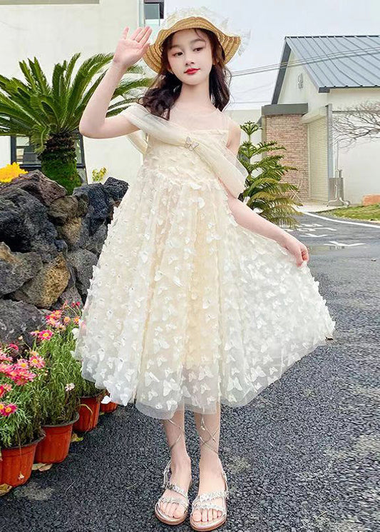 Beautiful Beige O-Neck Butterfly Tulle Girls Long Dresses Summer TT033