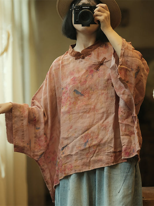 Women Summer Vintage Flower Slant Button-up Ramie Shirt ZZ1026