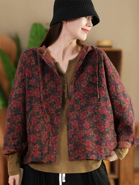 Women Vintage Autumn Flower Button Cotton Linen Hooded Coat AH1013