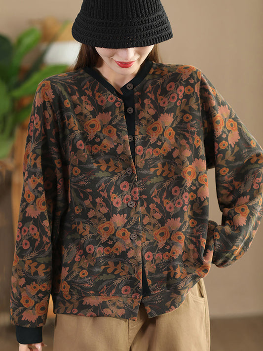 Women Vintage Flower Colorblock Button Cotton Coat AT1027
