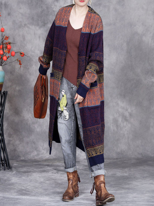 Women Winter Artsy Colorblock Cardigan Long Coat AH1020