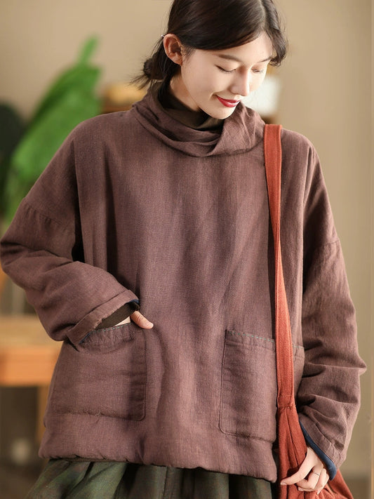 Women Autumn Vintage Turtleneck Solid Linen Padded Coat WG012