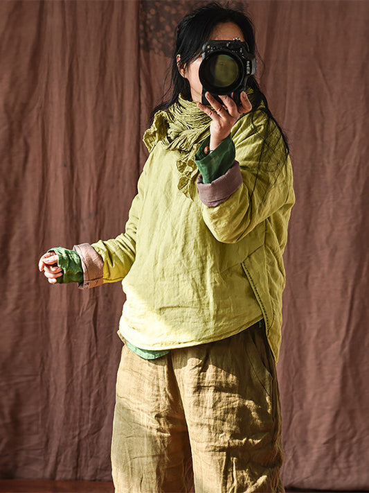 Women Autumn Flower Colorblock Stand Collar Cotton Coat AT1046