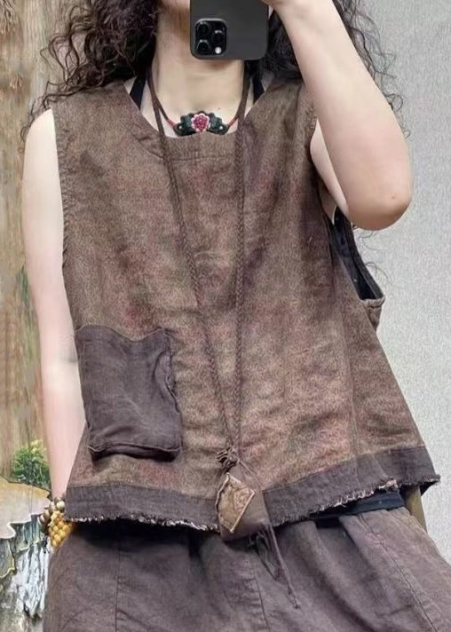 Vintage Blue O-Neck Print Pockets Linen Waistcoat Sleeveless VV011