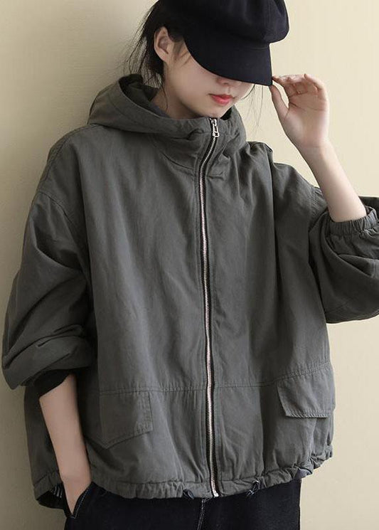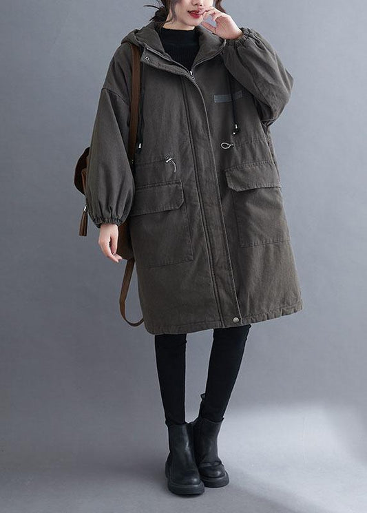 Luxury Grey hooded Loose drawstring Winter Cotton Coats Long sleeve QS045