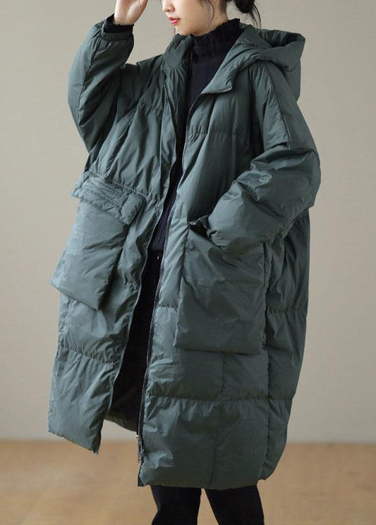 Plus Size Green hooded Zippered Pockets Winter Down Coat Long sleeve QS034