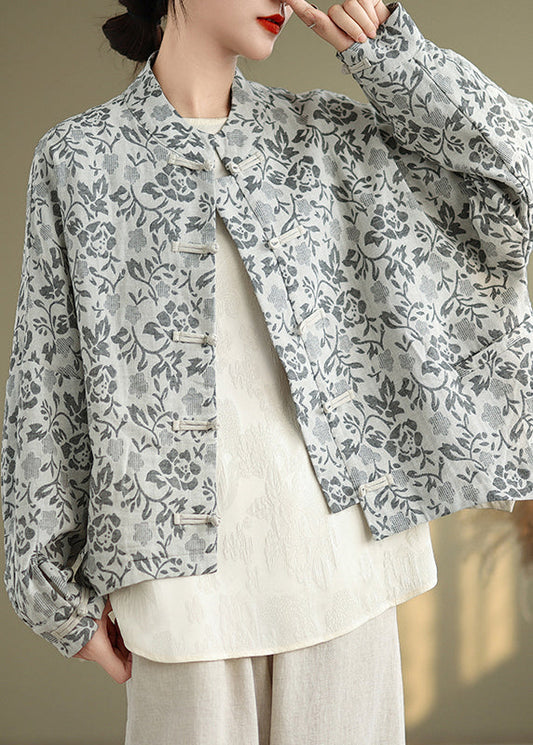 Loose Blue Stand Collar Print Button Cotton Coat Fall QG045