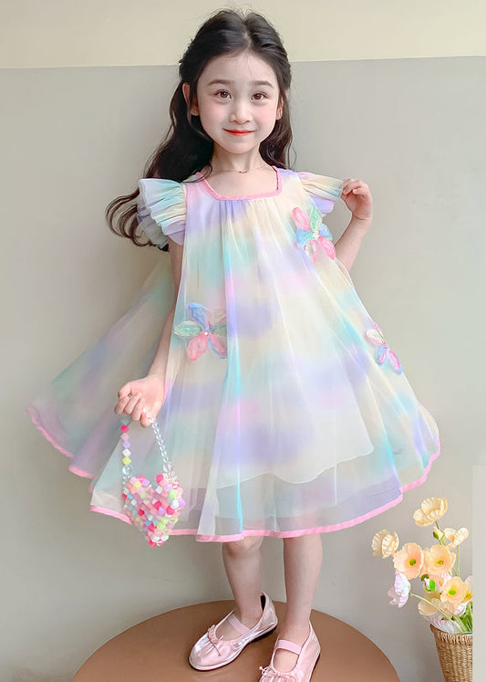 Stylish Rainbow O-Neck Tulle Patchwork Cotton Girls Dress Summer EW053