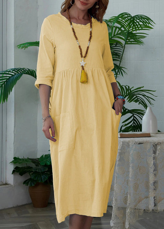 French Yellow Print V Neck Cotton Dress Long Sleeve FF075