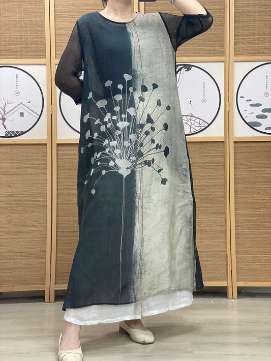Women Summer Vintage Print Spliced Ramie Dress PP1001