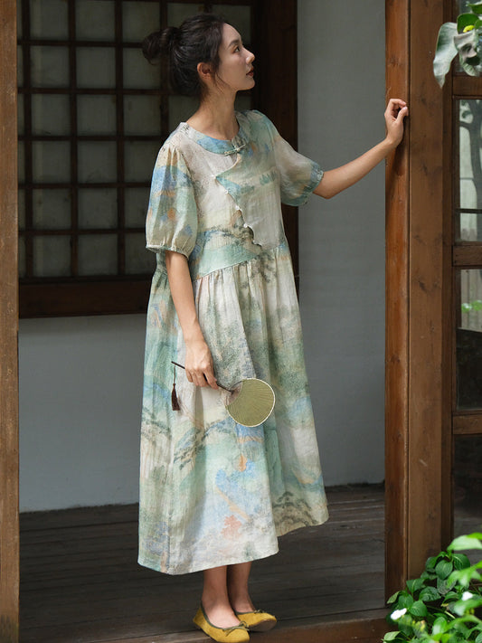 Women Summer Vintage Print Ramie Loose Dress OO1009