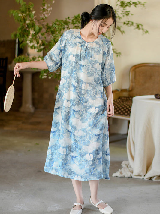 Women Summer Artsy Flower Print Loose Ramie Dress OO1025
