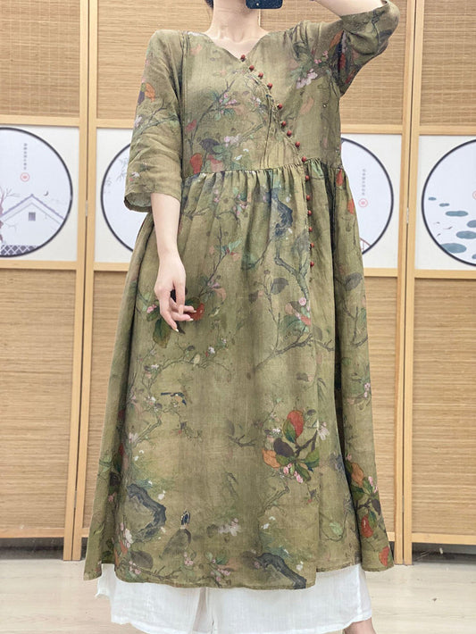 Women Ethnic Flower Button V-Neck Ramie Dress OO1002