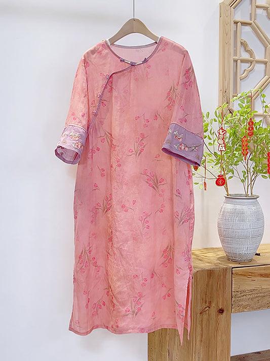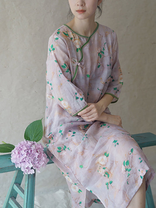 Women Summer Vintage Floral O-Neck Thin Ramie Dress II1045