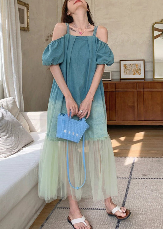 Gradient Color Blue Tulle Patchwork Spaghetti Strap Long Dress Short Sleeve UU1025