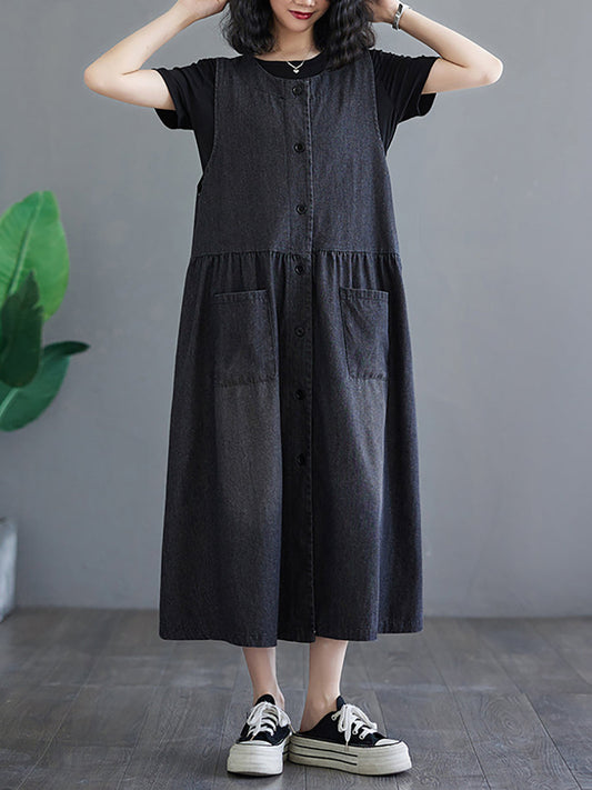 Women Summer Solid Denim Button-up Vest Dress OP1040