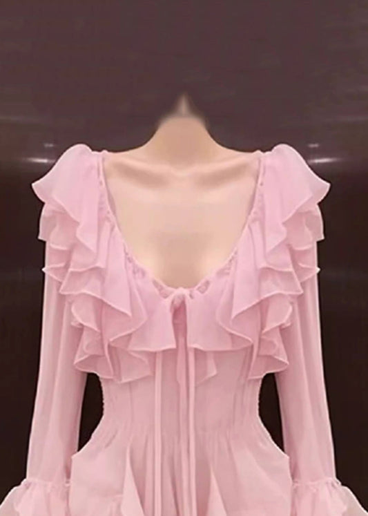 Novelty Pink Ruffled Lace Up Chiffon Mid Dress Long Sleeve EE1050