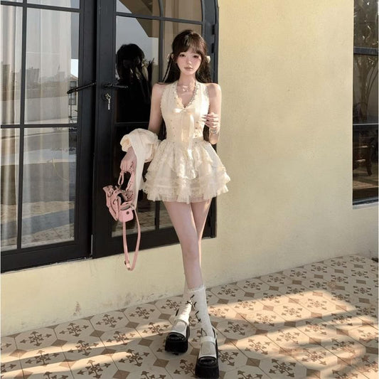 Halter V-Neck Bow Accent Studded Open Back Lace Mini A-Line Dress / Plain Button-Up Crop Cardigan
