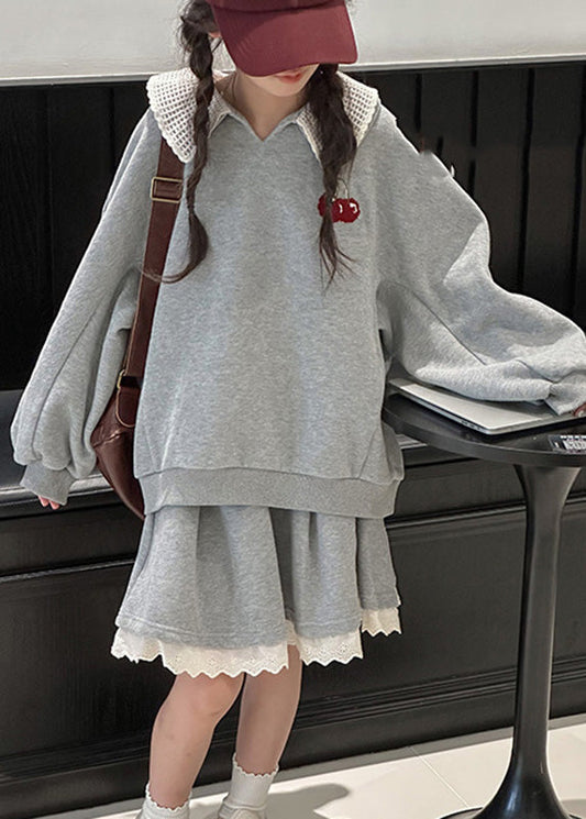 Loose Grey V Neck Cotton Kids Pullover And Skirts Two Piece Set Spring TV026