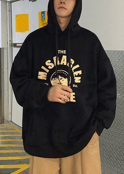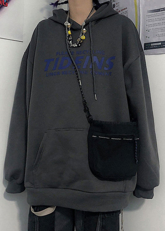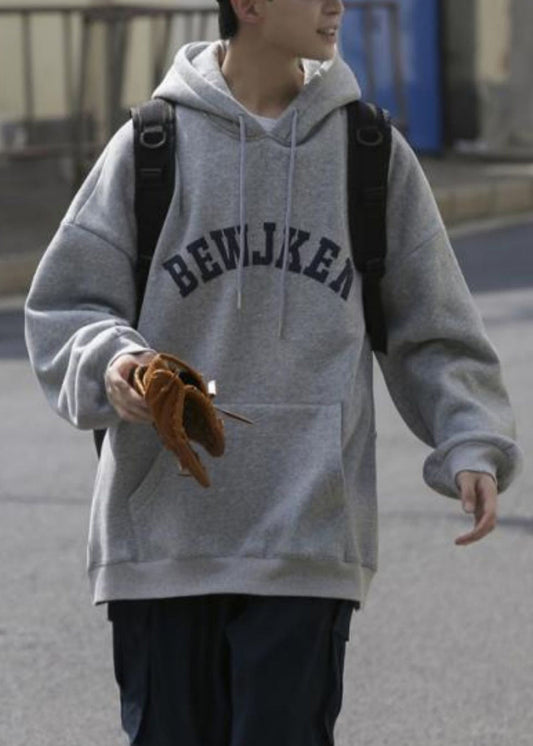 Loose Light Grey Hooded Lace Up Print Warm Fleece Mens Sweatshirts Spring YQ034
