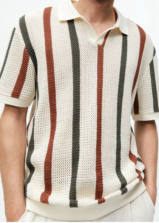 Khaki T Size Plus Summer Knit Shirt Out Striped Men Hollow