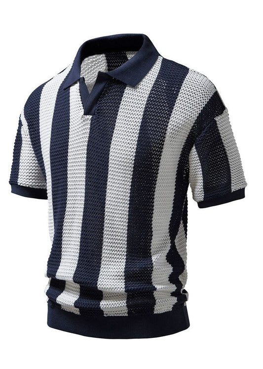 Striped Shirt Polo Knit And Loose Men Hollow Navy Out