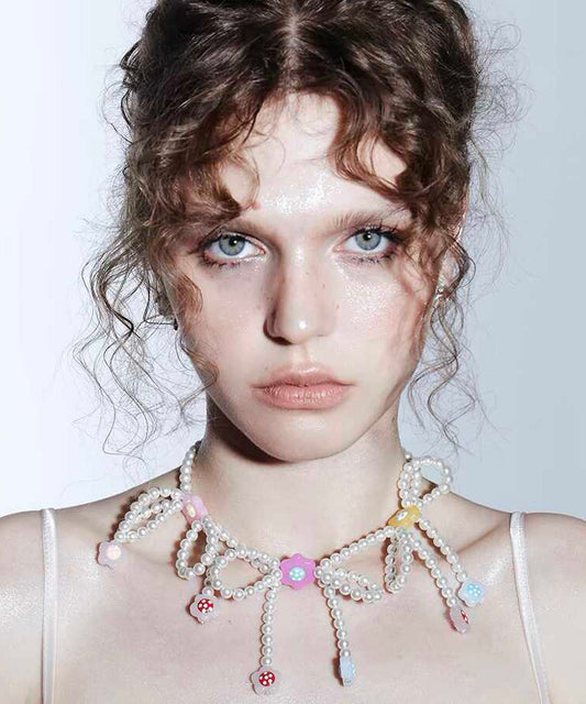 Art White Alloy Beading Pearl Bow Tassel Pendant Necklace QJ014