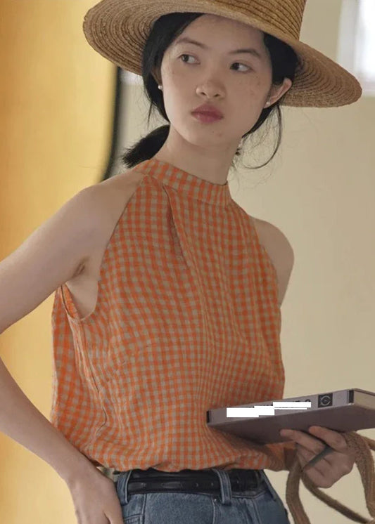 Natural Navy Blue Cold Shoulder Plaid Lace Tie Vest Sleeveless UU1007