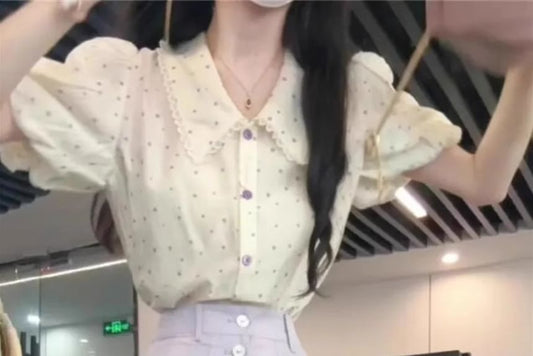 Puff Sleeve Contrast Collar Lace Trim Blouse / High Waist Plain Ruffle Tiered Mini A-Line Skirt / Set