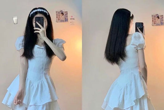 Set: Puff-Sleeve Sweetheart Peplum Top + Ruffled Mini Skirt