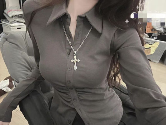 Long-Sleeve Collared Plain Shirt / Round Neck Plain Button Jacket