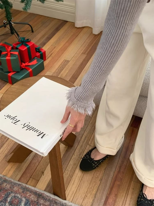 Long-Sleeve V-Neck Fringed Button Ribbed Knit Top