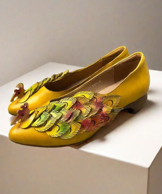 New Retro Ethnic Style Yellow Pointed Toe Cowhide Leather Shoes KJ055