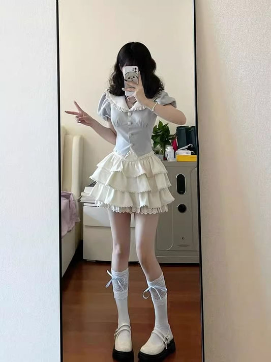 Puff Sleeve Contrast Collar Lace Trim Blouse / High Waist Plain Ruffle Tiered Mini A-Line Skirt / Set