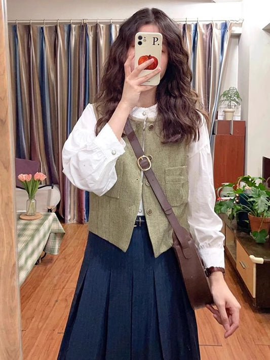Long-Sleeve Stand Collar Plain Button-Up Blouse / Round Neck Vest / High Rise Striped Pleated Midi A-Line Skirt / Set
