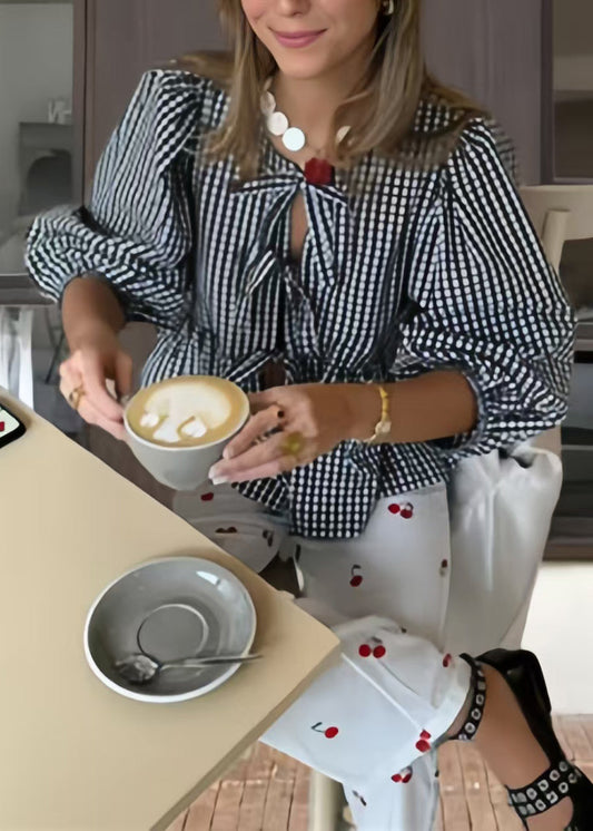 Puff Lace Size Plus Shirts Blue Sleeve Cotton Summer Up Plaid
