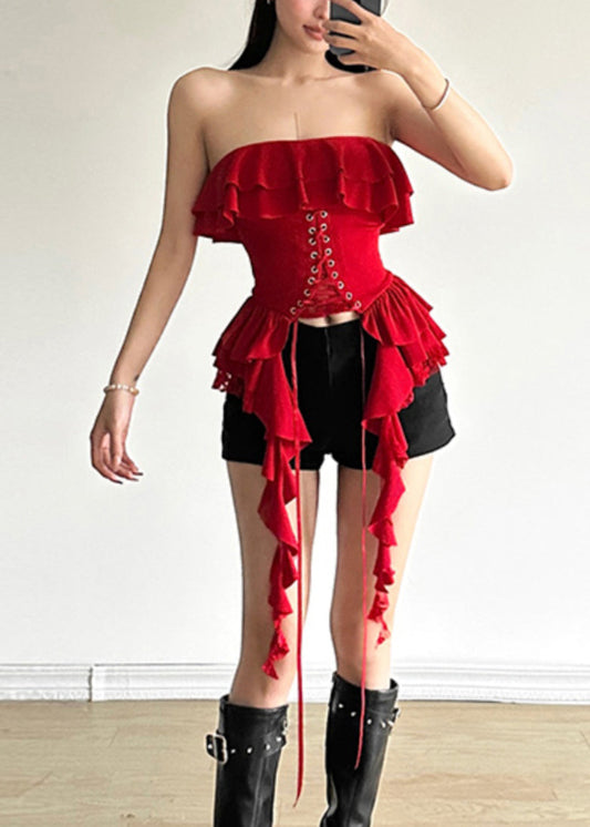 Unique Red Slash Neck Lace Up Cotton Tops Sleeveless EE1041