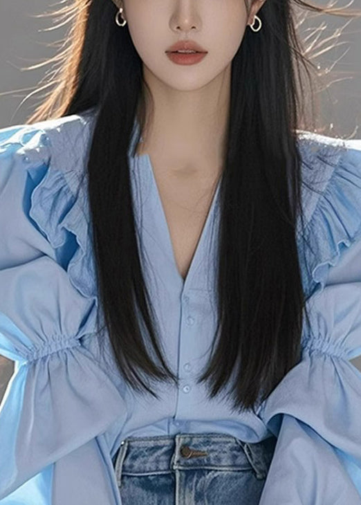 Neck V Cotton Blouse Fall Blue Italian Wrinkled