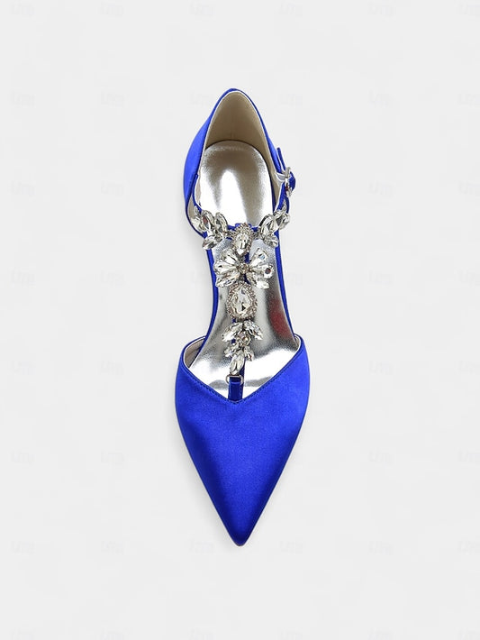 Navy Women's Heels Toe – Blue T-Strap Pointed Satin