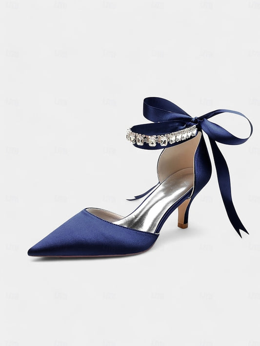 Ankle Pointed-Kitten Rhinestone Heels Strap Blue with Satin and
